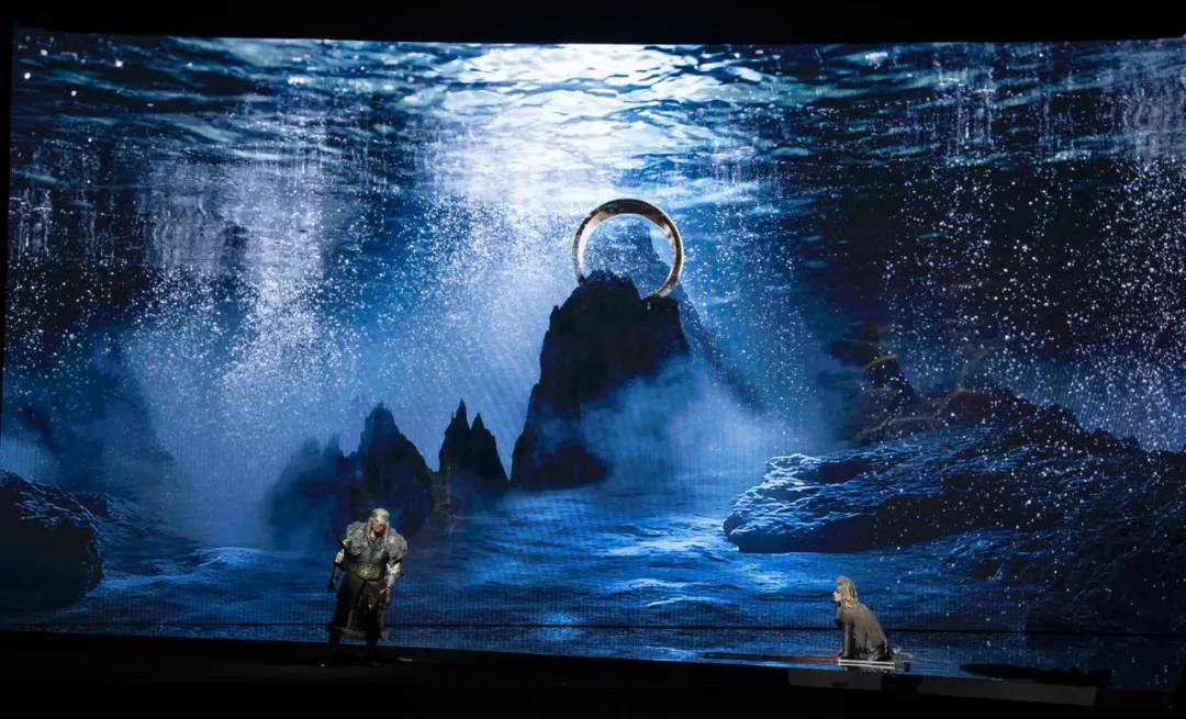 歌剧第一幕中洪丁的居所以树干的形象展现,背景中旋转的两个星球仿佛对应着齐格蒙德与齐格琳德逐渐靠近的心灵,当洪丁出场时森林背景飞舞着令人不安的蝙蝠,而当恋人相互倾诉爱意时,阴森的树干瞬间开启,化作春意盎然的花园。第二幕的舞台以山石代替了树干,一座直通舞台顶部的石桥代表着神界。舞台背景中的多媒体在这一幕中扮演着最为突出的“叙事注脚”角色,精确对应着剧中人唱出的意象,弗里卡口中即将崩溃的神界对应熔岩中的一片废墟,数道光束聚焦在沃坦张开的双臂展示他内心的煎熬,莱茵河底的指环、云团中浮现的“狼”型、荒芜的冰山场景、两位巨人石像在决斗中走向破碎……“指环”复杂的故事背景、人物跌宕的内心状态全部伴随着舞台上的视觉叙事徐徐展开。